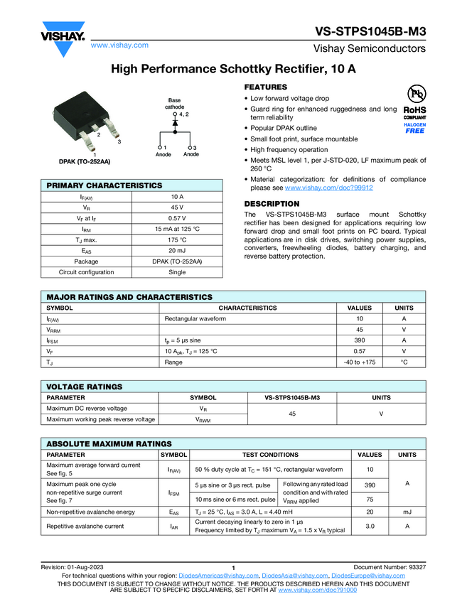 High Performance Schottky Rectifier, 10 A