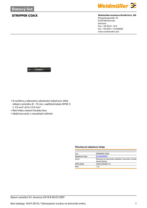 Weidmüller 9918030000 STRIPPER COAX Ściągacz izolacji Kompatybilność kabel koncentryczny, kabel danych, okrągły 4.8 do 7