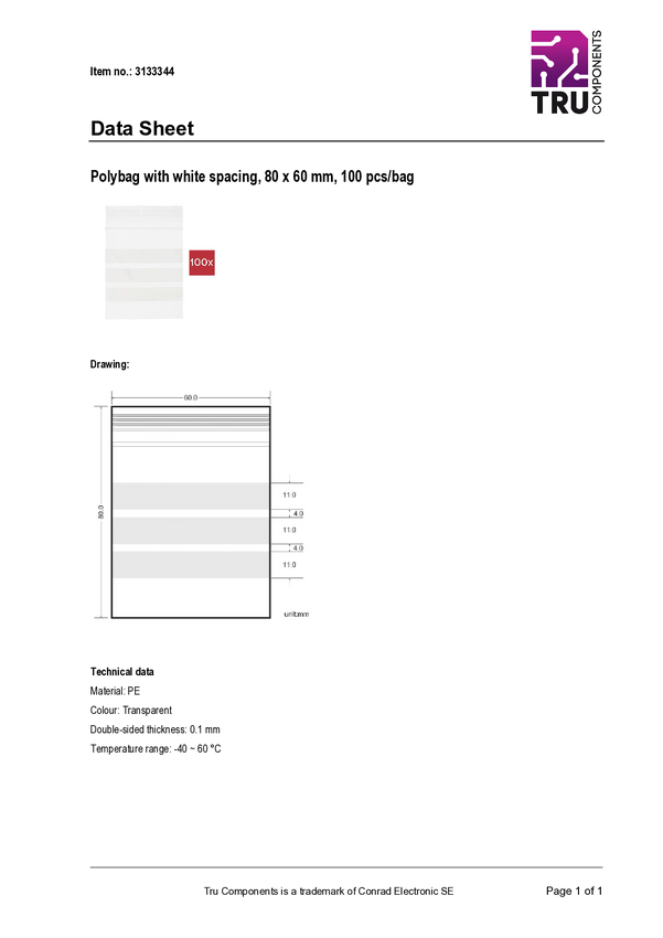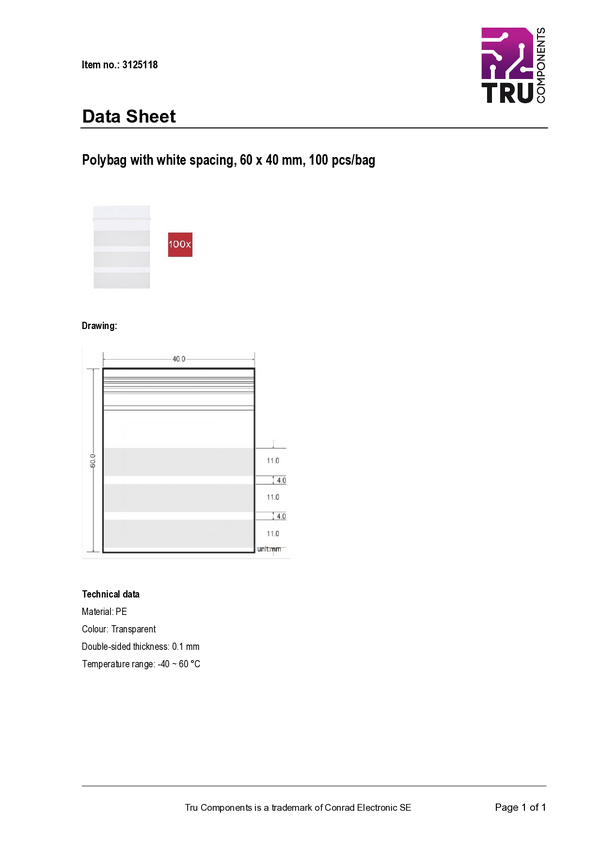 TRU COMPONENTS Woreczek strunowy z paskiem opisowym (D x S) 60 mm x 40 mm przeźroczysty polietylen 100 szt.