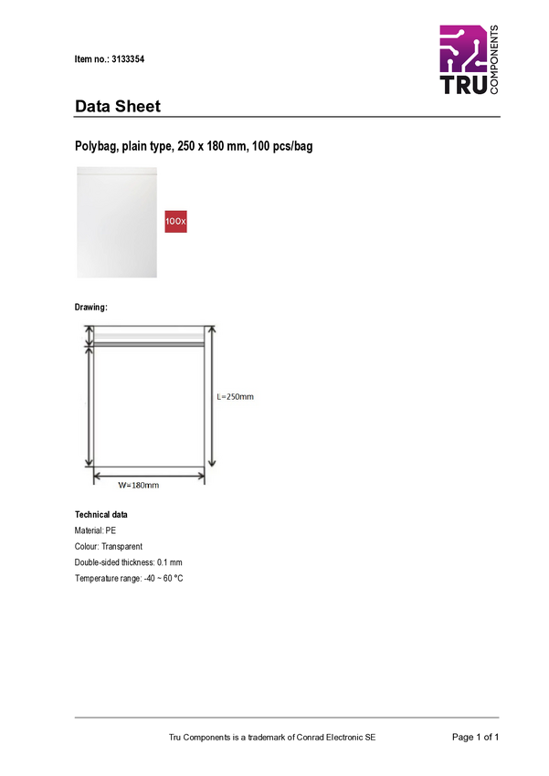 TRU COMPONENTS Woreczek strunowy bez paska opisowego (D x S) 250 mm x 180 mm przeźroczysty polietylen 100 szt.