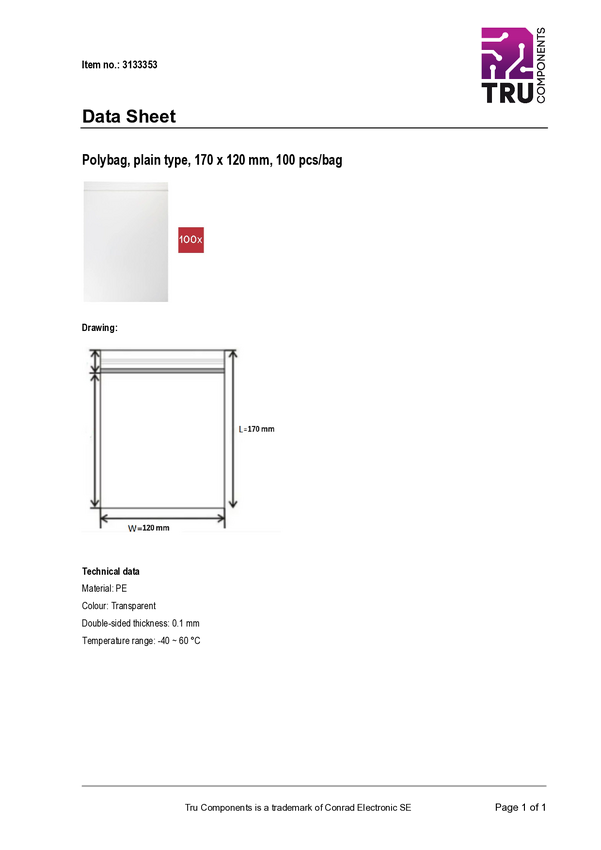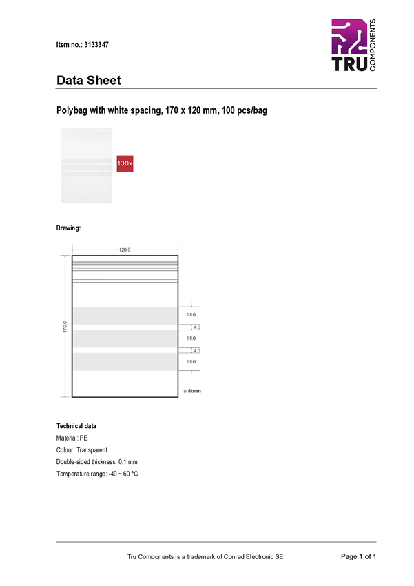 TRU COMPONENTS Woreczek strunowy z paskiem opisowym (D x S) 170 mm x 120 mm przeźroczysty polietylen 100 szt.