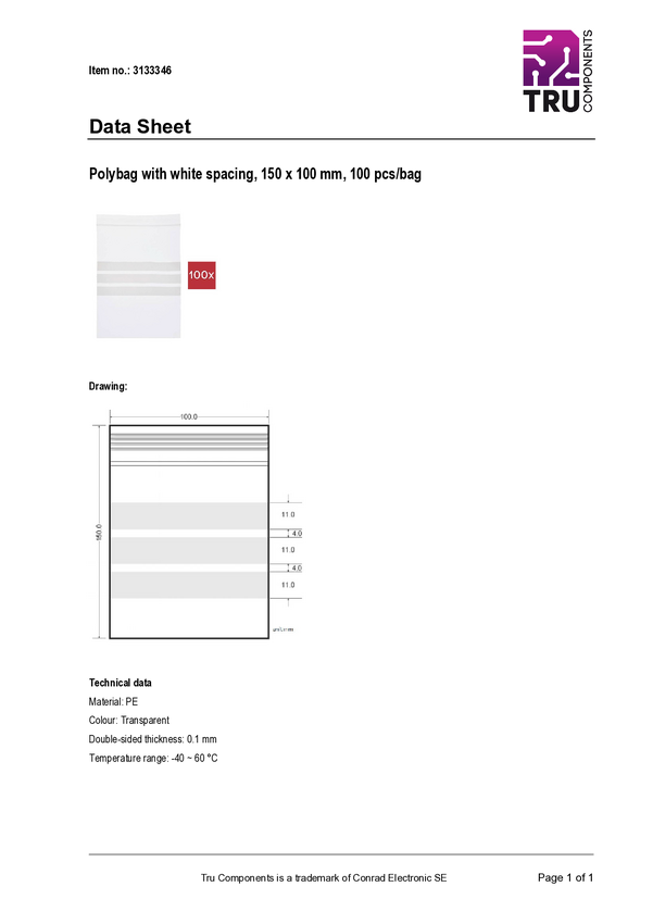 TRU COMPONENTS Woreczek strunowy z paskiem opisowym (D x S) 150 mm x 100 mm przeźroczysty polietylen 100 szt.