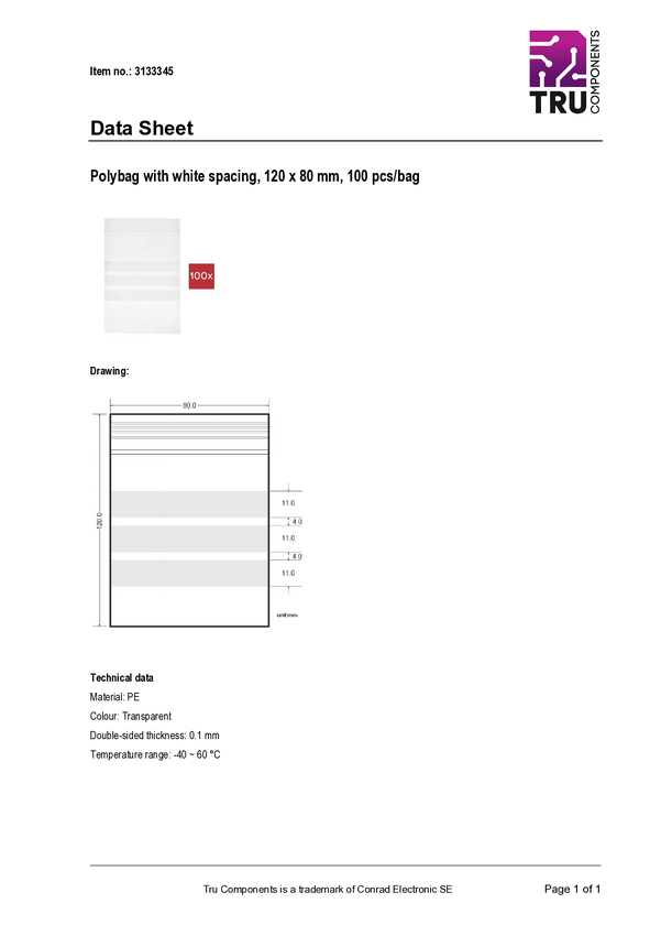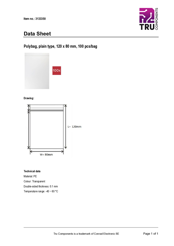 TRU COMPONENTS Woreczek strunowy z paskiem opisowym (D x S) 120 mm x 80 mm przeźroczysty polietylen 100 szt.