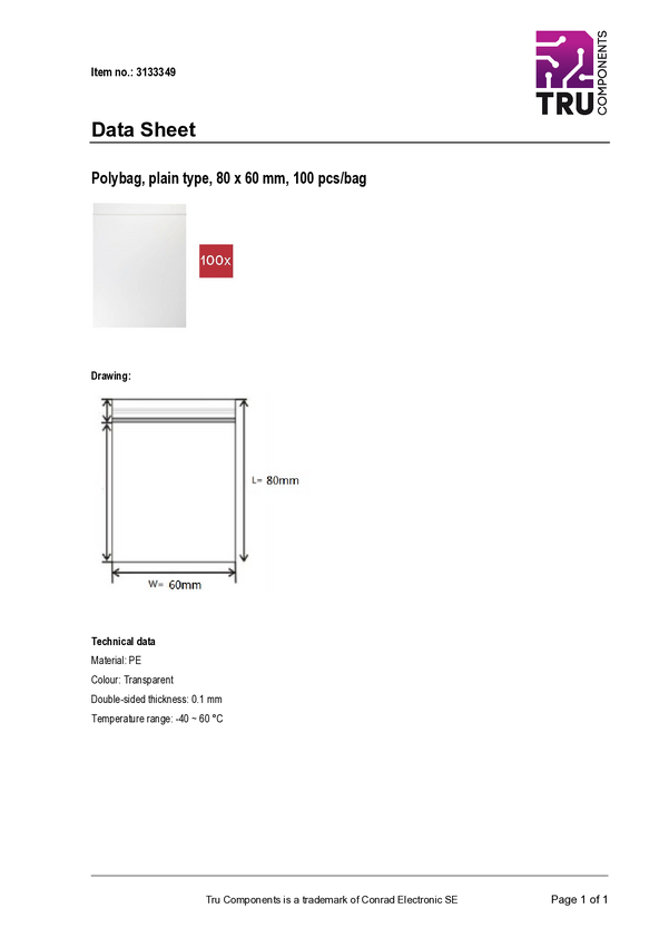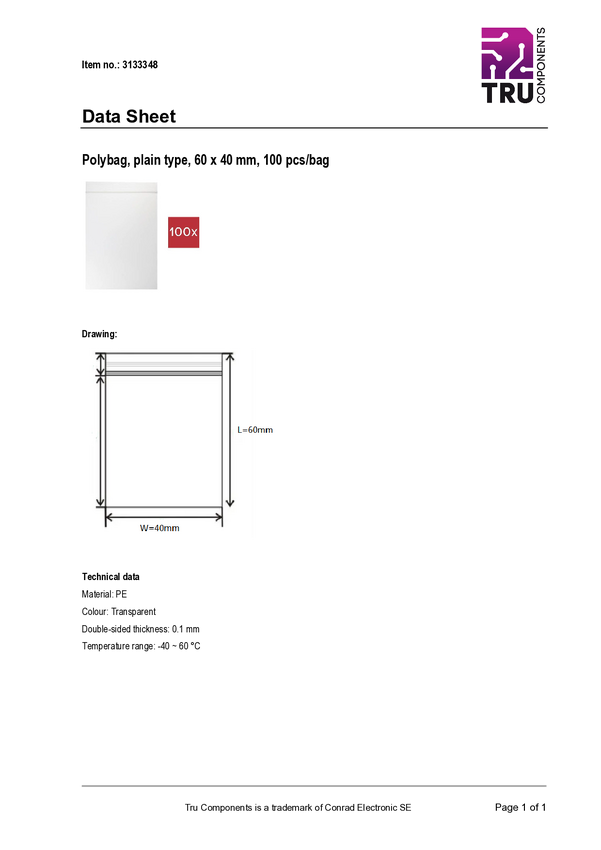 TRU COMPONENTS Woreczek strunowy bez paska opisowego (D x S) 60 mm x 40 mm przeźroczysty polietylen 100 szt.