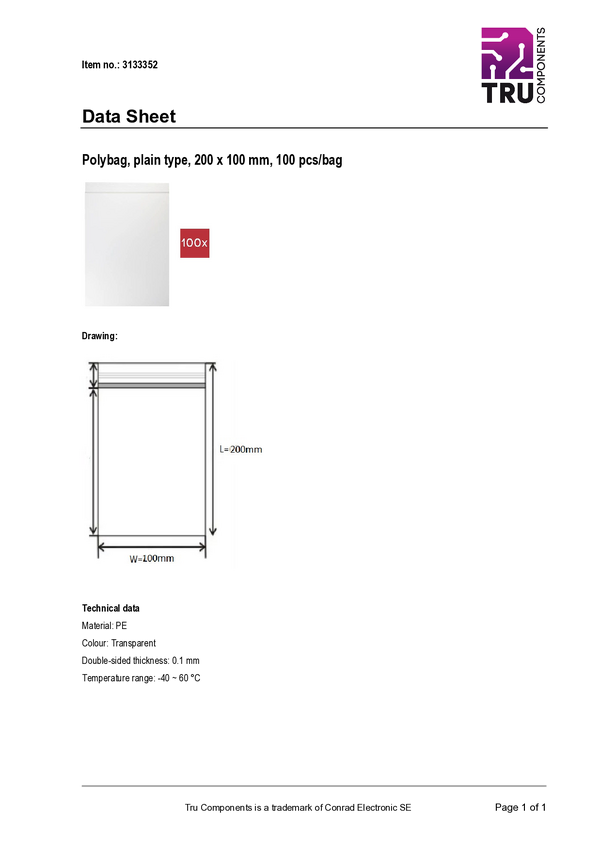 TRU COMPONENTS Woreczek strunowy bez paska opisowego (D x S) 200 mm x 100 mm przeźroczysty polietylen 100 szt.