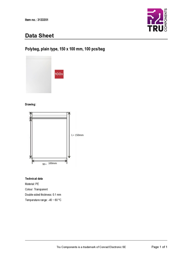 TRU COMPONENTS Woreczek strunowy bez paska opisowego (D x S) 150 mm x 100 mm przeźroczysty polietylen 100 szt.