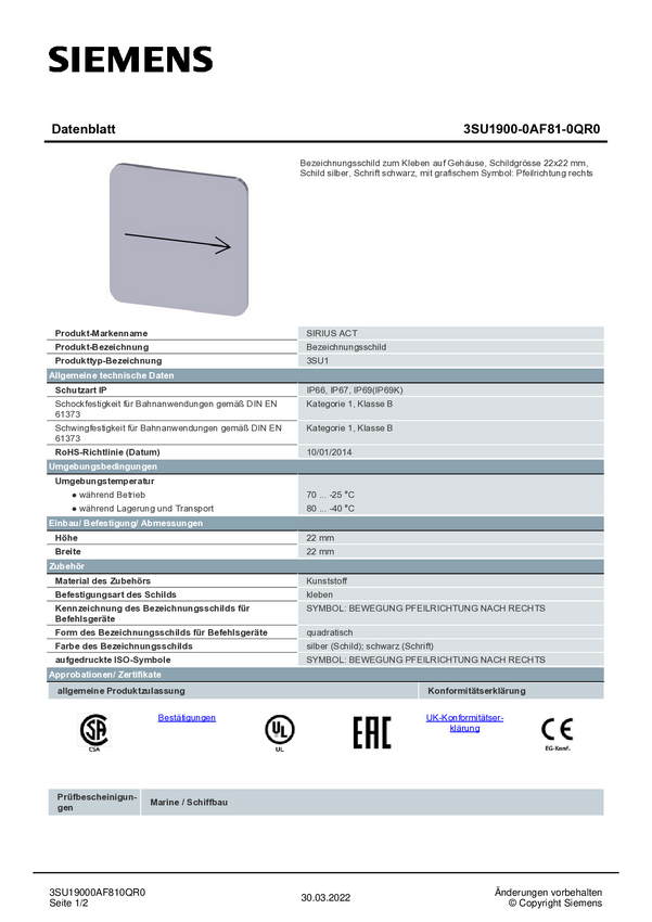 Tabliczka opisowa Siemens 3SU1900-0AF81-0QR0 (S x W) 22 mm x 22 mm symbol strzałki 10 szt.