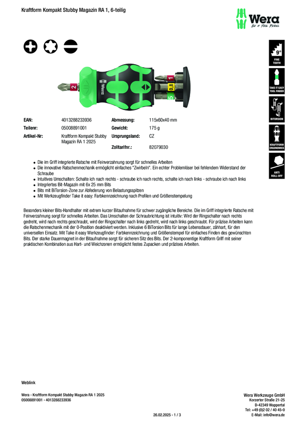 Zestaw bitów Wera Kompakt Stubby Magazin RA 1 2025 05008891001 produkt uniwersalny