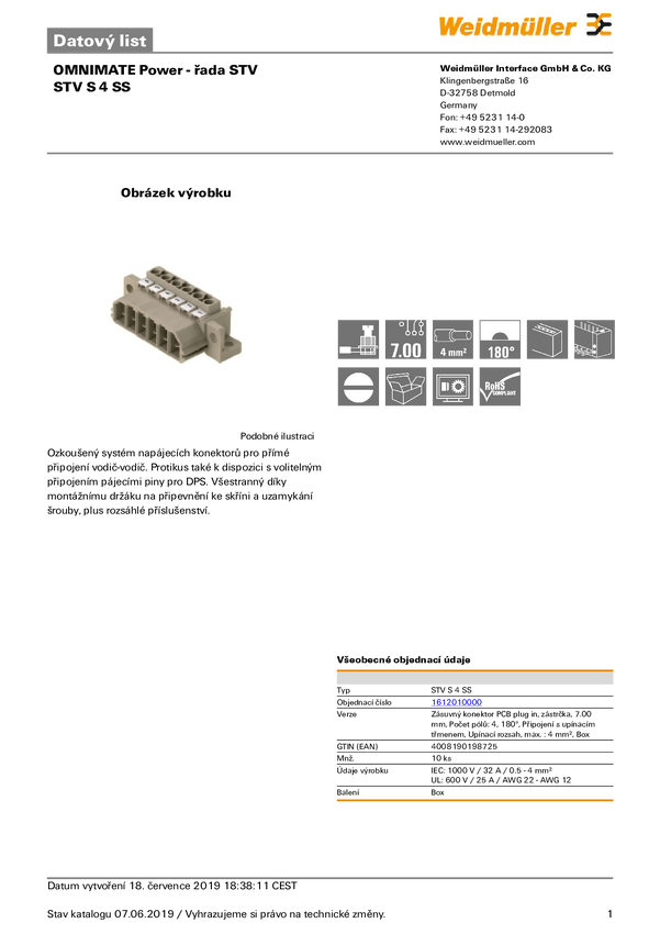 Weidmüller 1612710000 Obudowa złącza pin męskiego na kabel STV S 4 LB180, wire-to-board, piny: 4, 17 A, 10 szt.