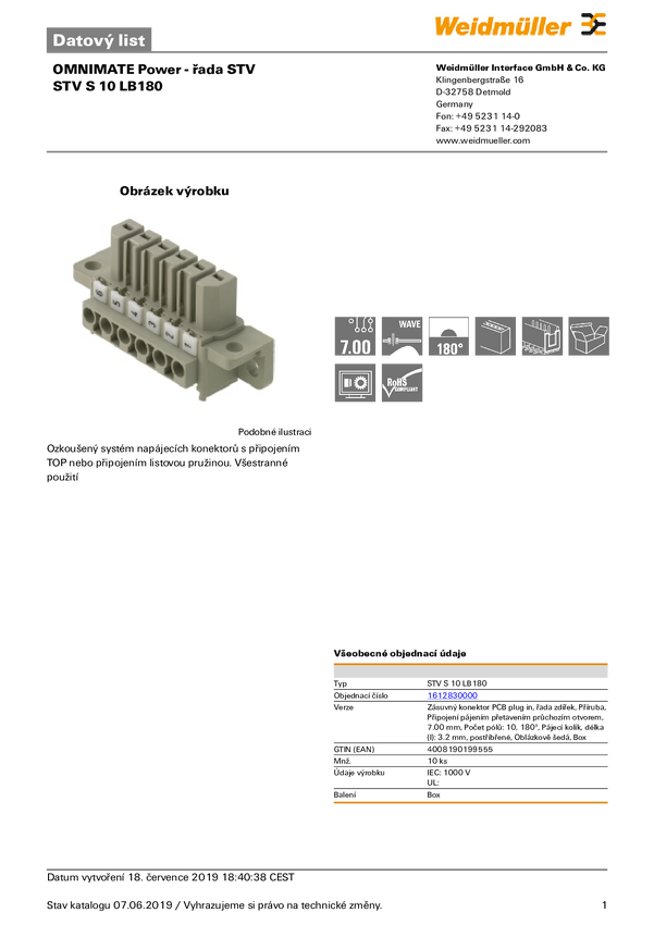 Weidmüller 1612830000 Obudowa złącza pin męskiego na kabel STV S 10 LB180, wire-to-board, piny: 10, 25 A, 10 szt.