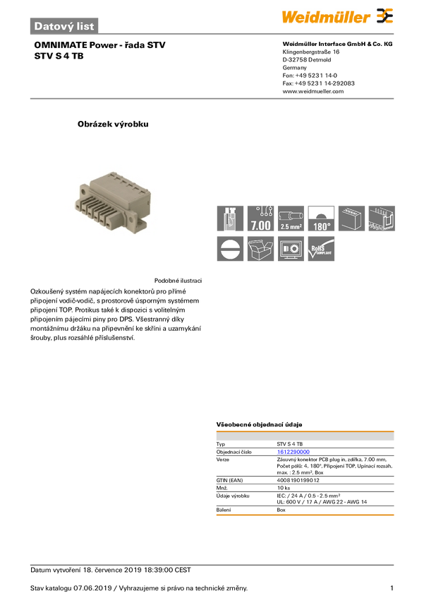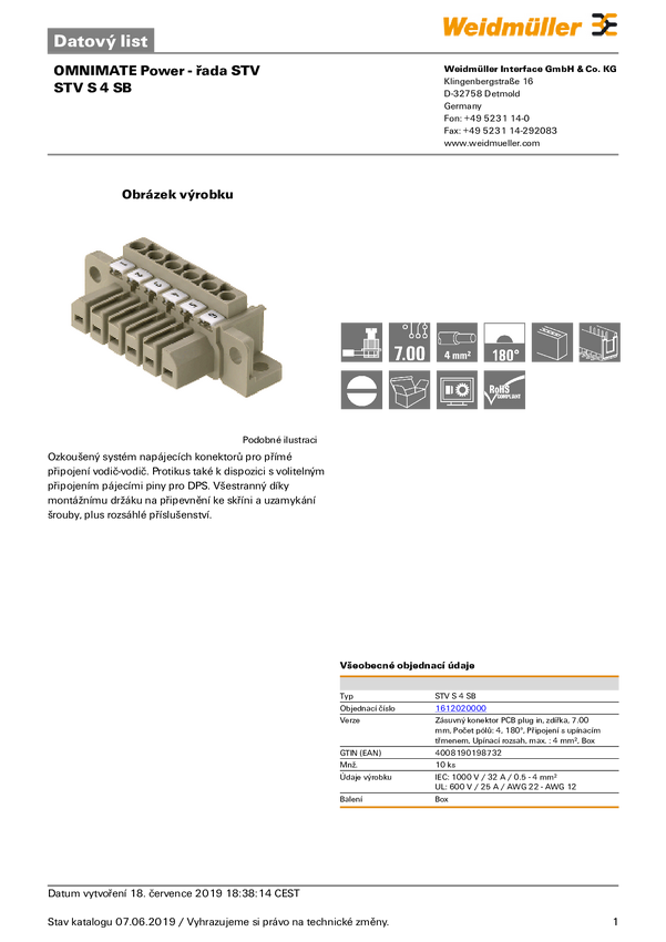 Weidmüller 1612290000 Obudowa złącza pin męskiego na kabel STV S 4 TB, wire-to-board, piny: 4, 17 A, 10 szt.