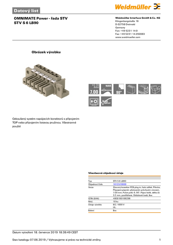 Weidmüller 1612570000 Obudowa złącza pin męskiego na kabel STV S 6 LB90, wire-to-board, piny: 6, 25 A, 10 szt.