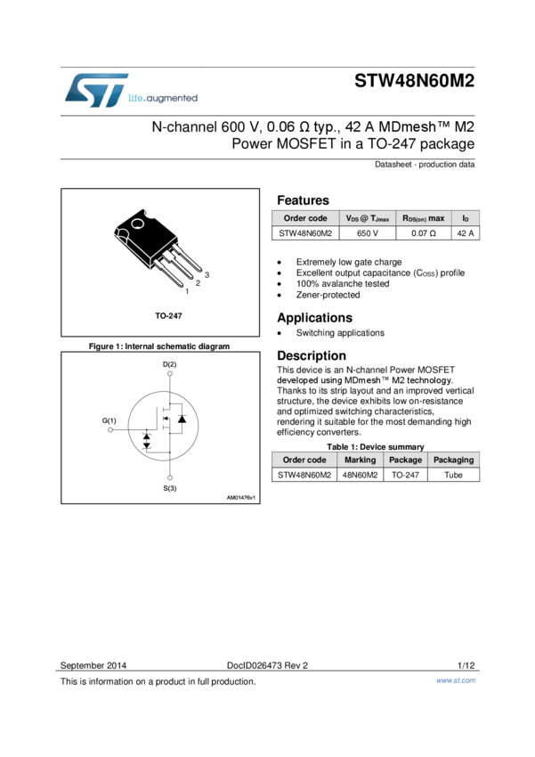 N-channel 600 V, 0.06 Ohm typ., 42 A MDmesh M2 Power MOSFET in TO-247 package