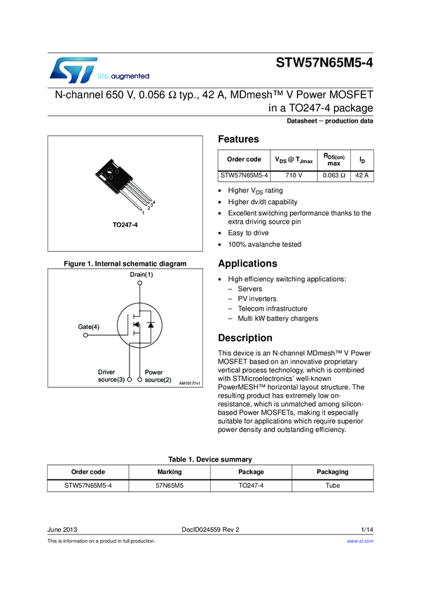 N-channel 650 V, 0.056 Ohm typ., 42 A MDmesh(TM) V Power MOSFET in a TO247-4L package