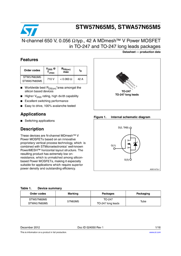 N-channel 650 V, 0.056 Ohm typ., 42 A MDmesh M5 Power MOSFET in TO-247 package