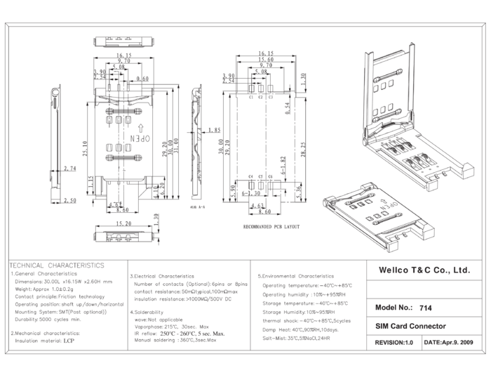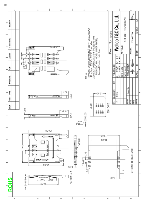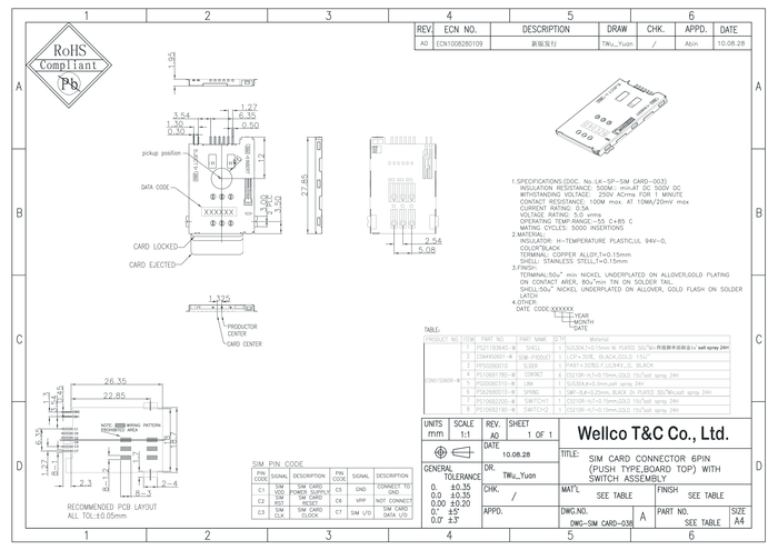 Podstawka SIM, 6-stykowa + switch , taśmowane 900szt/rolka, WELLCO
