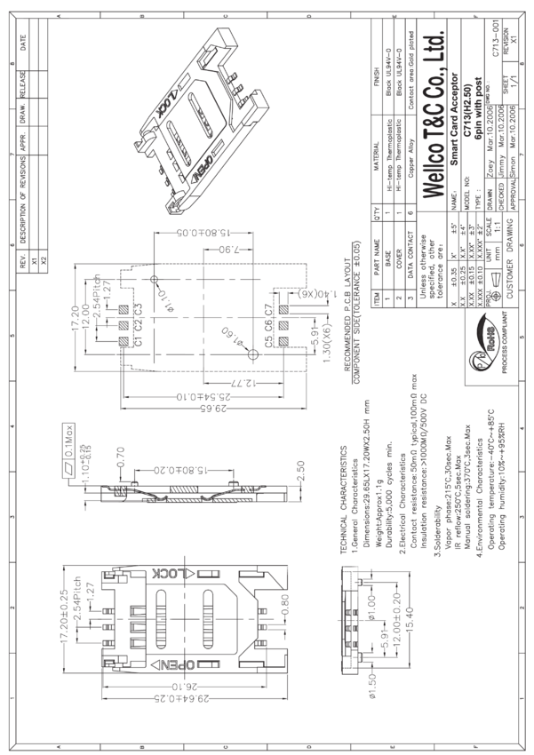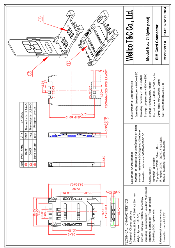 Podstawka SIM, 6-stykowa, , taśmowane 900szt/rolka, WELLCO