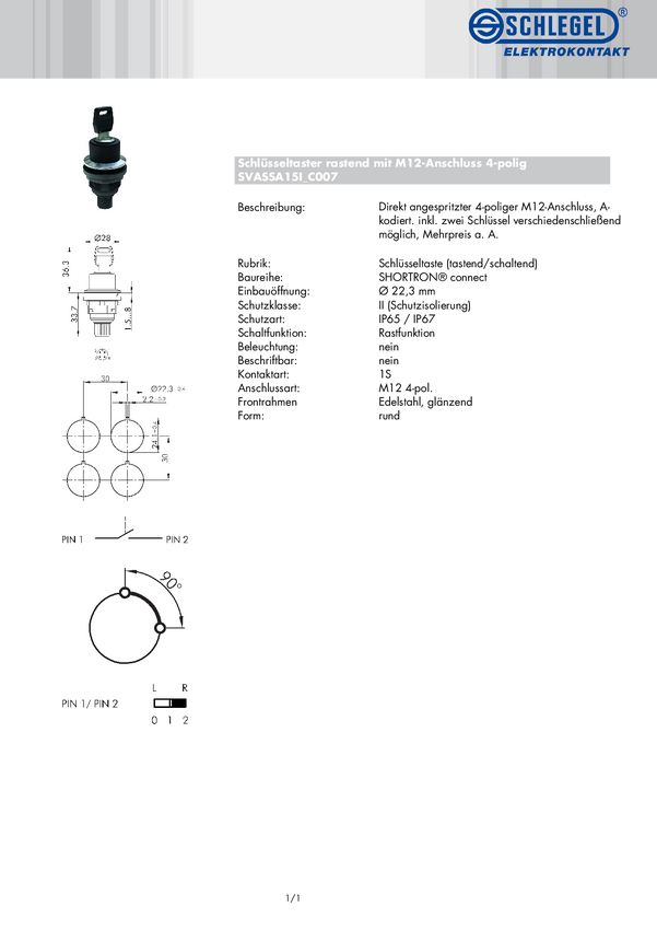 Schlegel SVASSA15I_C007 SVASSA15I_C007 Przycisk kluczykowy manualne, klucz 1 szt.