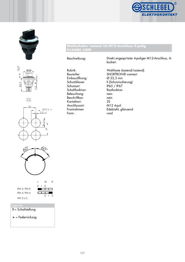 Schlegel SVASSA12II_C009 SVASSA12II_C009 Przycisk kluczykowy manualne, klucz 1 szt.