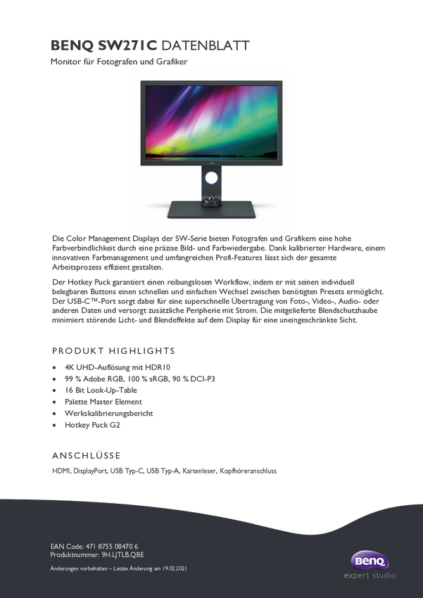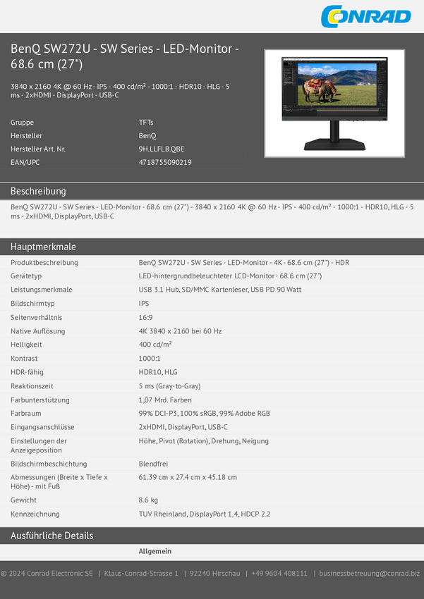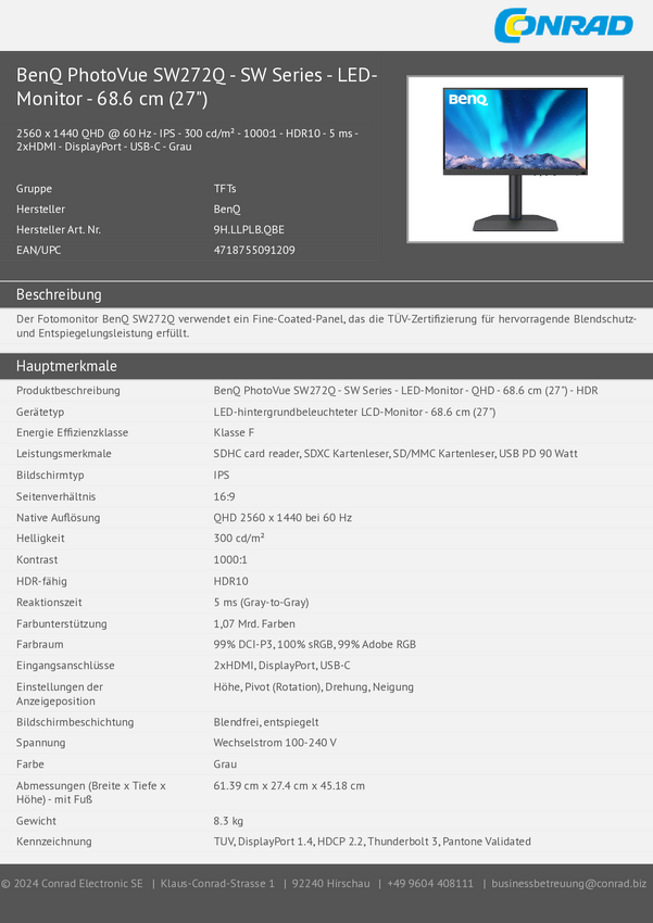 BenQ SW271C Monitor EEK G (A - G) 68.6 cm (27 cal) 3840 x 2160 px 16:9 5 ms DisplayPort, HDMI, czytnik kart, słuchawki (