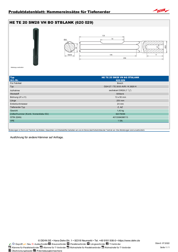DEHN 620029 HE TE 20 SW28 VH BO STBLANK Użycie młotka