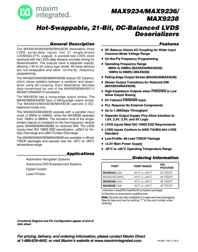 MAX9234, MAX9236, MAX9238 Hot-Swappable, 21-Bit, DC-Balanced LVDS Deserializers