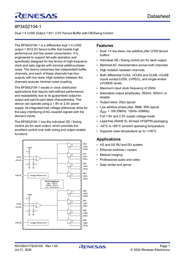 Dual 1:4 LVDS Output 1.8V/2.5V Fanout Buffer with OE/Swing Control