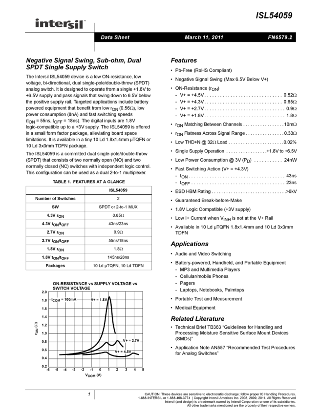 Negative Signal Swing, Sub-ohm, Dual SPST Single Supply Switch