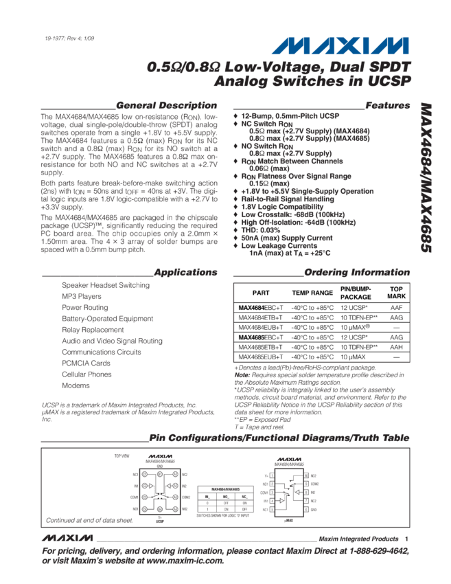 MAX4684, MAX4685 0.5Ω/0.8Ω Low-Voltage, Dual SPDT Analog Switches in UCSP