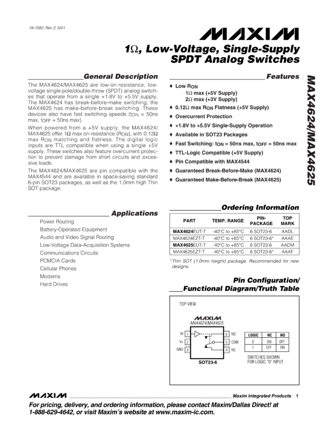 MAX4624, MAX4625 1Ω, Low-Voltage, Single-Supply, SPDT Analog Switches