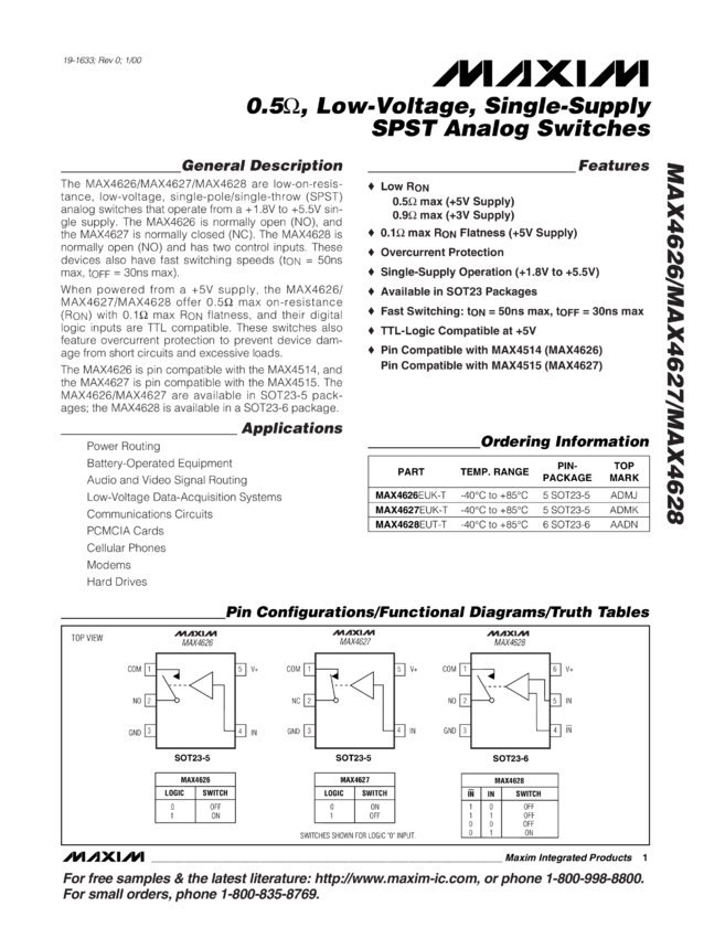 MAX4626, MAX4627, MAX4628 0.5Ω, Low-Voltage, Single-Supply SPST Analog Switches