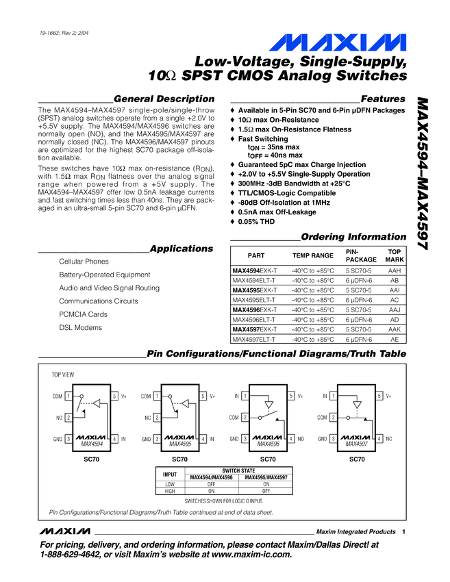 MAX4594, MAX4595, MAX4596, MAX4597 Low-Voltage, Single-Supply, 10Ω SPST CMOS Analog Switches