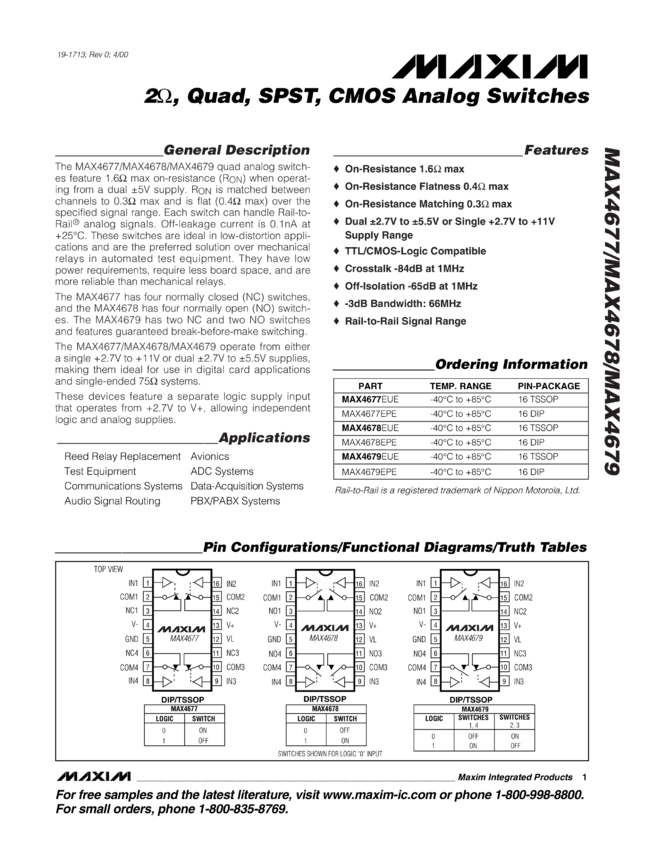 MAX4677, MAX4678, MAX4679 2Ω, Quad, SPST, CMOS Analog Switches