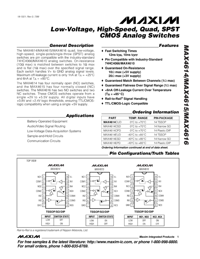 MAX4614, MAX4615, MAX4616 Low-Voltage, High-Speed, Quad, SPST CMOS Analog Switches