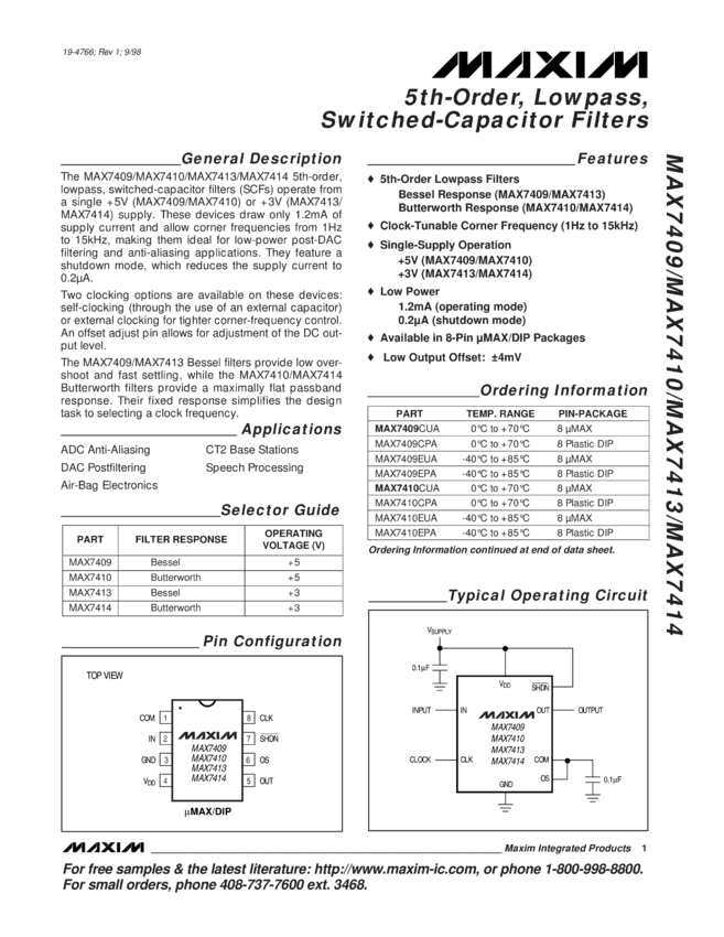 MAX7409, MAX7410, MAX7413, MAX7414 5th-Order, Lowpass, Switched-Capacitor Filters