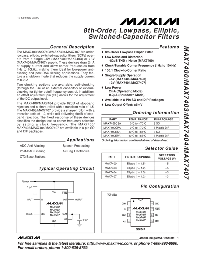 MAX7400, MAX7403, MAX7404, MAX7407 8th-Order, Lowpass, Elliptic, Switched-Capacitor Filters