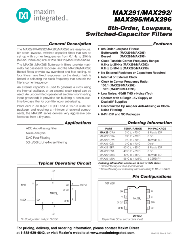 MAX291, MAX292, MAX295, MAX296 8th-Order, Lowpass, Switched-Capacitor Filters