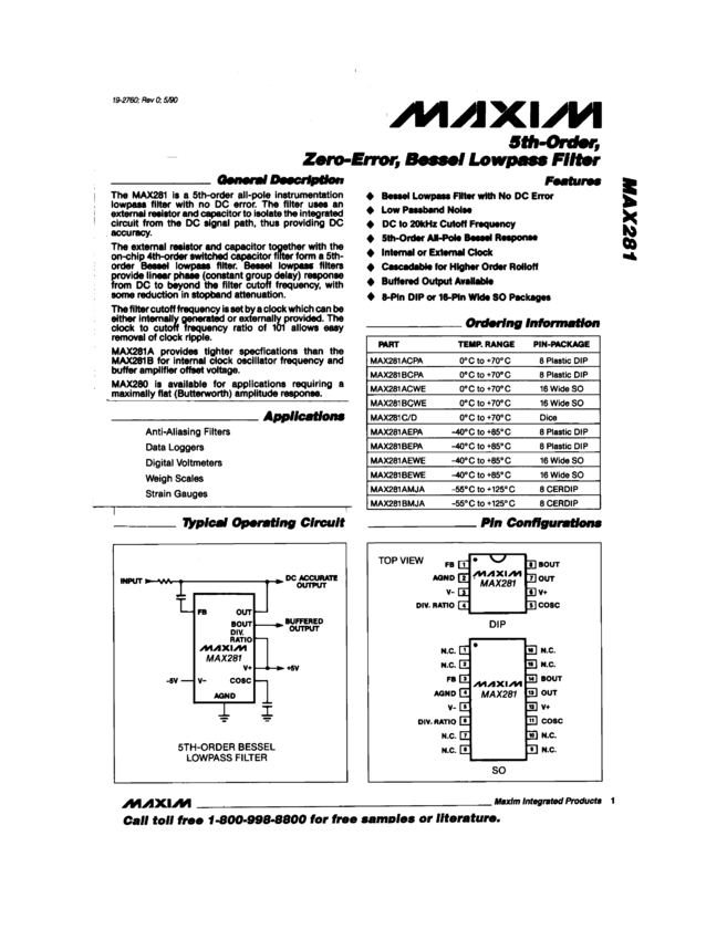 MAX281 5th Order, Zero Error, Bessel, Switched Capacitor Lowpass Filter