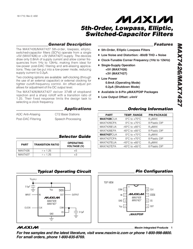 MAX7426, MAX7427 5th-Order, Lowpass, Elliptic, Switched-Capacitor Filters