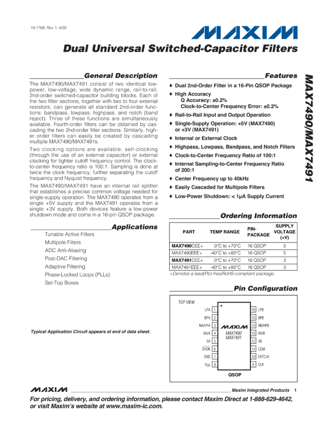 MAX7490, MAX7491 Dual Universal Switched-Capacitor Filters