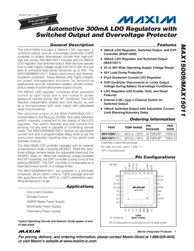 MAX15009, MAX15011 Automotive 300mA LDO Regulators with Switched Output and Overvoltage Protector