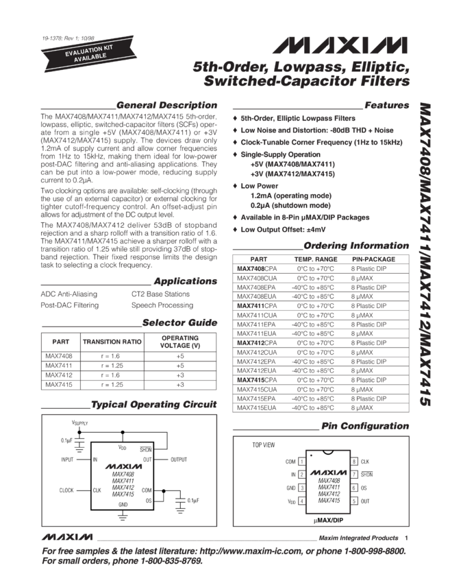 MAX7408, MAX7411, MAX7412, MAX7415 5th Order, Lowpass, Elliptic, Switched-Capacitor Filters