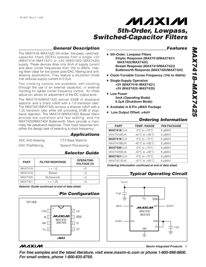 MAX7418, MAX7419, MAX7420, MAX7421, MAX7422, MAX7423, MAX7424, MAX7425 5th-Order, Lowpass, Switched-Capacitor Filters