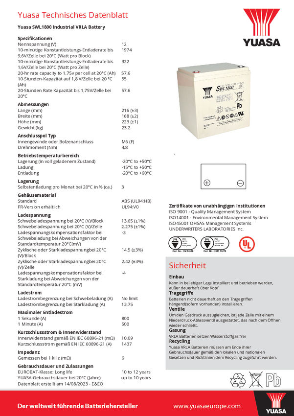 Akumulator ołowiowy Yuasa SWL1800, AGM, 12 V, 55 Ah