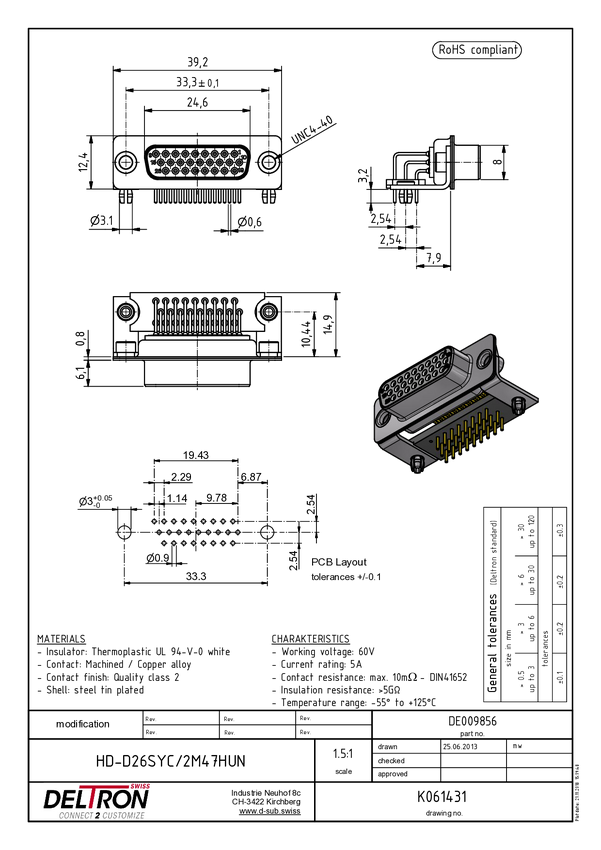 Deltron Connectors Deltron HD-D 62 SYC2 M47H UN Złącze żeńskie D-Sub 90 ° Ilość styków: 62 lutowane, piny 1 szt.