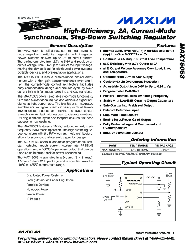 MAX15053 High-Efficiency, 2A, Current-Mode Synchronous, Step-Down Switching Regulator
