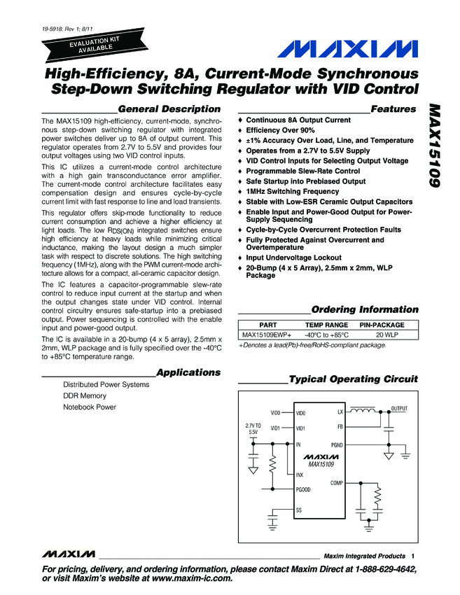 MAX15109 High-Efficiency, 8A, Current-Mode Synchronous Step-Down Switching Regulator with VID Control