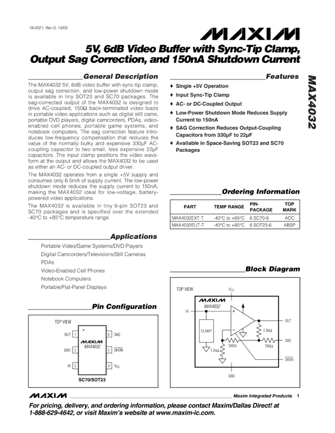 MAX4032 5V, 6dB Video Buffer with Sync-Tip Clamp, Output Sag Correction, and 150nA Shutdown Current