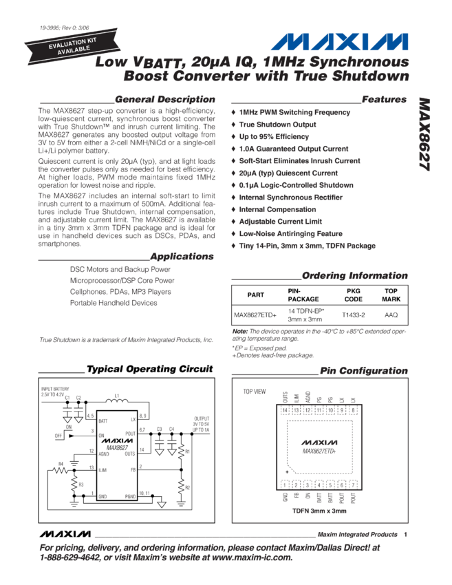 MAX8627 Low VBATT, 20µA IQ, 1MHz Synchronous Boost Converter with True Shutdown