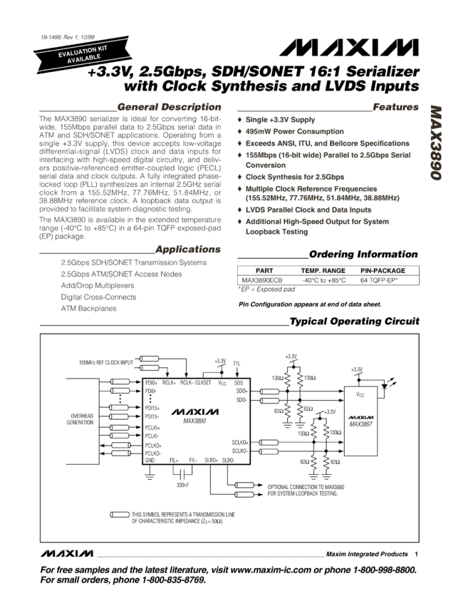 MAX3890 +3.3V, 2.5Gbps, SDH/SONET 16:1 Serializer with Clock Synthesis and LVDS Inputs